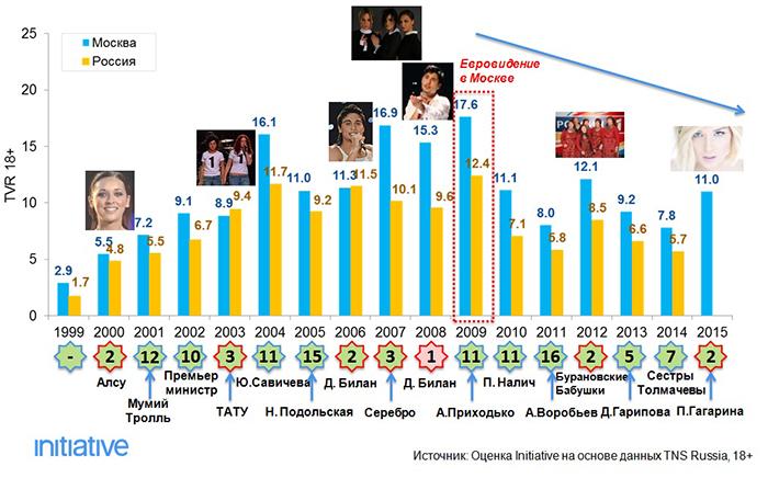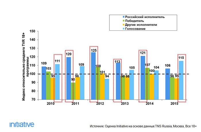 По данным исследования, сохраняется долгосрочный тренд на снижение просмотра шоу после 2009 года – самого рейтингового по показателю TVR (17.6 по Москве и 12.4 по России). В 2015 году телесмотрение Евровидения в Москве выросло, однако не достигло уровня 2012 года, когда Россия также заняла второе место – 11.0 TVR и 12.1 TVR соответственно.