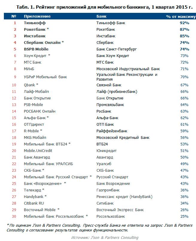 По результатам сравнения, лучшими приложениями были признаны мобильные банки «Тинькофф Банка», «Рокетбанка» и «Инстабанка». Все три упомянутых банка являются дистанционными и не имеют физических точек для обслуживания клиентов, что делает качество мобильного приложения критически важным для бизнеса.