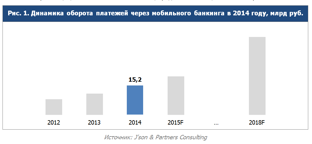 По предварительным оценкам J’son & Partners Consulting, в 2014 году оборот платежей с использованием мобильного банкинга составил 15,2 млрд рублей. По прогнозам в 2015 году, он увеличится на 30%, а среднегодовой темп роста с 2014 по 2018 гг. составит 28%. В исследовании также проанализированы основные показатели платежей через мобильный банк: структура, количество транзакций, количество пользователей, средняя комиссия, основные игроки.