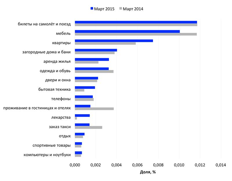 За год с марта 2014 по март 2015 доля запросов о дешёвых товарах почти не изменилась. Практически неизменным остался и список самых популярных товаров и услуг, которые ищут со словом «дёшево». Из значительных изменений — в семь раз выросла доля запросов о дешёвых лекарствах: в основном люди ищут аналоги дорогих препаратов. Кроме того, заметно выросла доля запросов о покупке недорогих квартир, бытовой техники и аренде жилья. А вот искать дешёвую мебель, такси и гостиницы стали меньше.