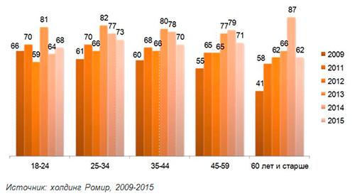 В отличие от прошлого года, когда запросы женщин впервые превзошли материальные притязания мужчин, в этом году женщины опять умерили свои аппетиты. Другие опросы «Ромир» также показывают, что в трудные времена женщины легче и охотнее встают на путь экономии, чем мужчины. Итак, мужчины в среднем заявили о среднем бюджете на семью в 70 800 рублей, а женщины – 67 300 руб. Если говорить о материальных запросах в различных возрастных группах, то в этом году полученные показатели оказались более однородными, чем, например, в прошлом, когда представления молодежи о «нормальном» семейном бюджете отличались в меньшую сторону от притязаний россиян старше 45 лет более чем на треть. Согласно последнему опросу, молодые семьи готовы уложиться в 68 тысяч рублей. Россияне 25-59 лет рассчитывают на «нормальную» жизнь при наличии 70-73 тысяч рублей в месяц (см. Диаграмму 2). При этом отметим, что только в молодежной группе запросы за год выросли, пусть и незначительно. Россияне же старше 60 лет сократили свои запросы более чем на четверть.