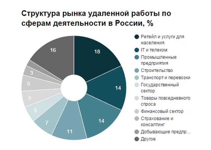 Опрос J’son & Partners Consulting, в котором приняли участие 315 руководителей из разных компаний в 15 регионах страны, показал, что в России более 40% фирм работает с удаленными сотрудниками. Доля крупных компаний (с числом работников более 250 человек) среди них составляет около 36%, а в Москве и Санкт-Петербурге — 41%. Больше всего удаленных сотрудников задействовано в ритейле, телекоммуникационной отрасли, промышленных, строительных и IT-компаниях.