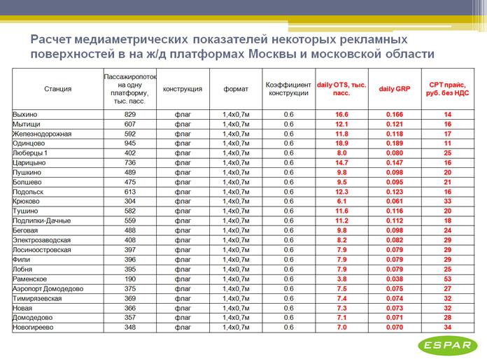 Расчет медиаметрических показателей флагов на платформах Москвы и Московской области Интересные медиаметрические показатели были рассчитаны для флагов, установленных на железнодорожных платформах. Несмотря на небольшой формат носителя (1,4х0,7 м, S=0,98 м2), daily OTS имеет достаточно высокие значения – в среднем 9,6 тыс. пассажиров по станциям в зоне до МКАД. Средний CPT флагов на платформах в Москве равен 26 рублям. Стоимость одного контакта – менее 3-х копеек.
