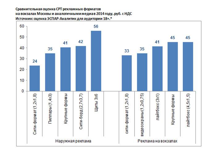 CPT по конструкциям РА «ЛАЙСА» на вокзалах Москвы сравним с аналогичным показателем форматов в сегменте наружной рекламы, а по отдельным рекламоносителям даже более привлекателен. Исследования в сегменте indoor, проведенные ЭСПАР-Аналитик, можно назвать беспрецедентными. Ранее таких масштабных медиаизмерений indoor-носителей в России не проводилось. Сравнительная оценка СРТ рекламных форматов на вокзалах Москвы и аналогичными медиа в 2014 году, руб. с НДС