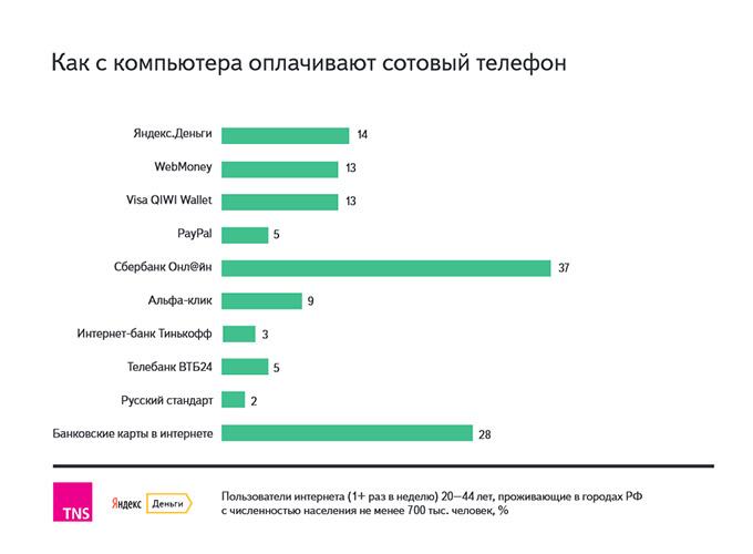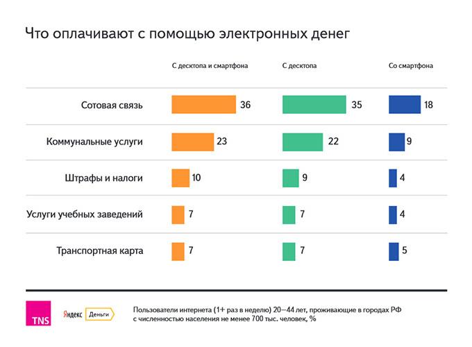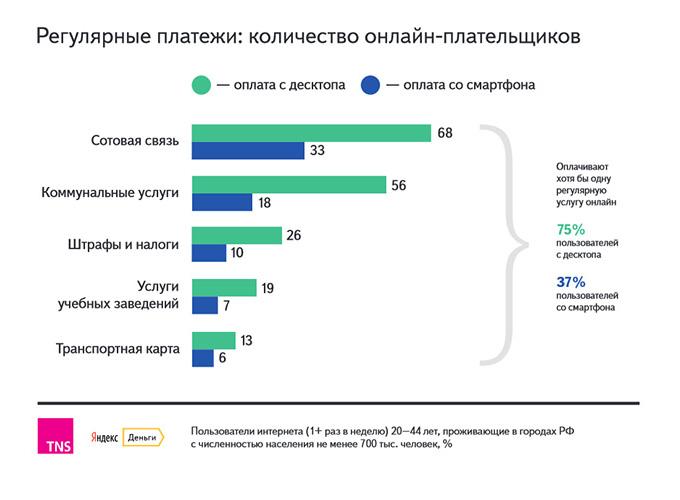 Самая популярная услуга, которую оплачивают через интернет, — сотовая связь: две трети россиян пополняют мобильный счёт с компьютера, а каждый третий — со смартфона. Вторая по популярности категория онлайн-оплаты — коммунальные услуги: с компьютера за них платят больше половины респондентов, а с мобильного устройства — почти каждый пятый. Уплата налогов и штрафов ГИБДД занимает третье по популярности место: каждый четвёртый опрошенный погашает долги перед государством с помощью десктопа, а каждый десятый — через смартфон.