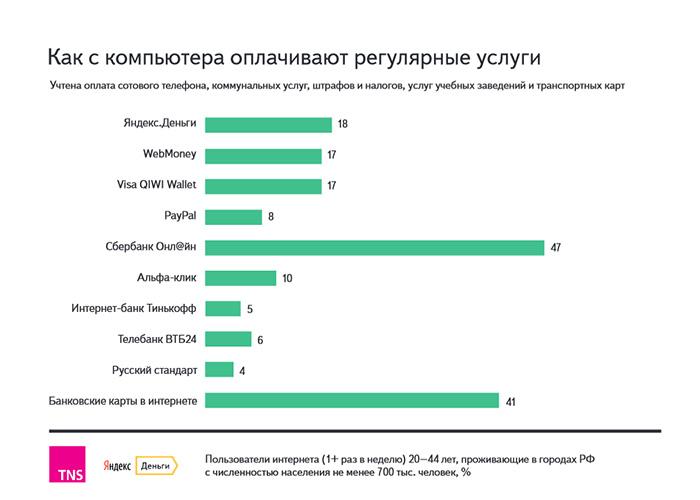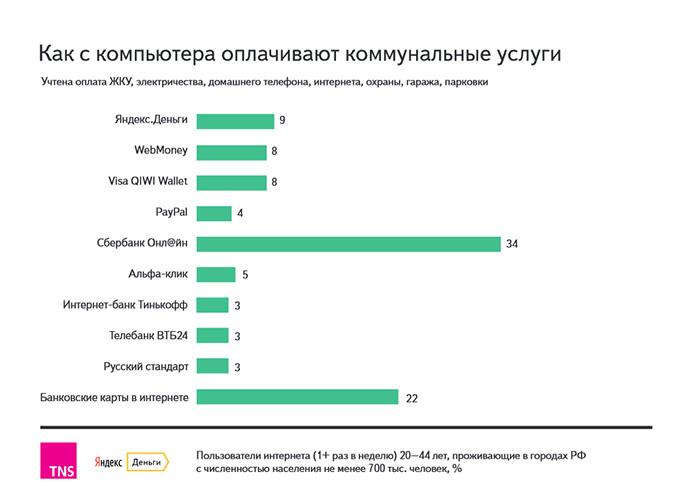 Чаще всего коммунальные услуги с компьютера россияне оплачивают с помощью интернет-банка Сбербанка: это делают 34% респондентов. С банковских карт за ЖКУ платят 22% опрошенных, а из кошелька в Яндекс.Деньгах или с привязанной к нему карты — 9%. Дальше в порядке убывания популярности следуют кошельки Qiwi, WebMoney, интернет-банк Альфа-Банка, кошелёк PayPal, интернет-банки ВТБ24, Тинькофф Банка и Русского Стандарта.