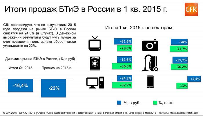 После высоких продаж в четвертом квартале 2014 года, в первом квартале 2015 года российский рынок бытовой техники и электроники (БТиЭ) показывает весьма низкую динамику. Продажи БТиЭ упали на 16,4% по стоимости. По итогам всего 2015 года ожидаются еще более низкие результаты: -22% в рублях. Количество проданных устройств может снизиться по сравнению с 2014 годом почти на четверть (-24,3%).