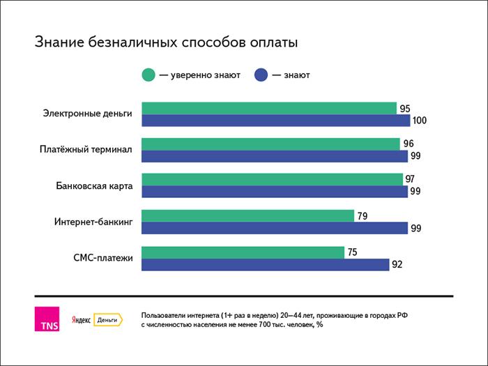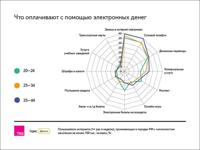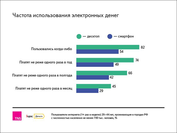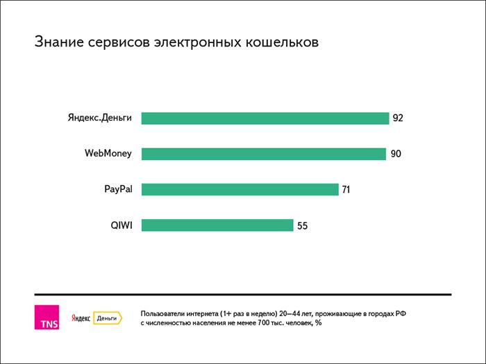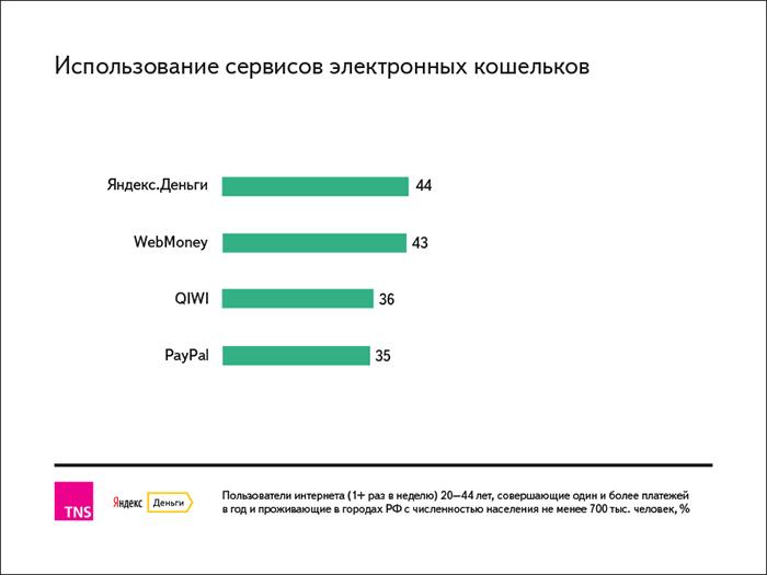 Яндекс.Деньги по-прежнему занимают первое место по узнаваемости и используемости среди всех платежных сервисов в России. С их помощью не реже чем раз в год платят 44% интернет-пользователей в возрасте от 20 до 44 лет, проживающих в крупных городах. Через WebMoney то же самое делают 43% россиян, через QIWI — 36%, PayPal — 35%.