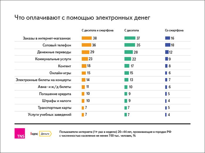 Пять самых популярных категорий платежей из электронных кошельков — интернет-покупки, сотовая связь, денежные переводы, коммунальные услуги и цифровой контент. С компьютеров чаще всего россияне оплачивают онлайн-покупки, а со смартфонов — мобильную связь.