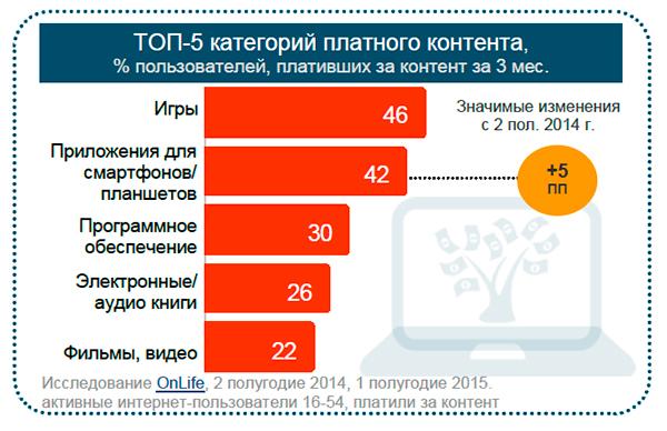 По данным исследования OnLife, средняя сумма затрат на веб-контент постепенно растет и в первом полугодии 2015 года составила 691 рубль, что на 51 рубль больше, чем во втором полугодии 2014 года. Однако только каждый третий активный интернет-пользователь платит за контент. Доля плативших за интернет-контент в первой половине 2015 года осталась неизменной относительно второго полугодия 2014 года – 33% активных пользователей сети.