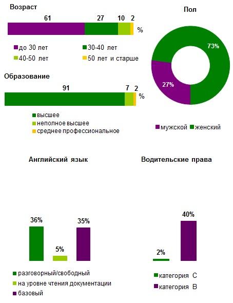 Среди соискателей должности PR-менеджера большинство составляют женщины (73%). Специалистов по связям с общественностью моложе 30 лет — 61%. 91% соискателей имеет высшее образование. 36% претендентов свободно владеют английским языком.