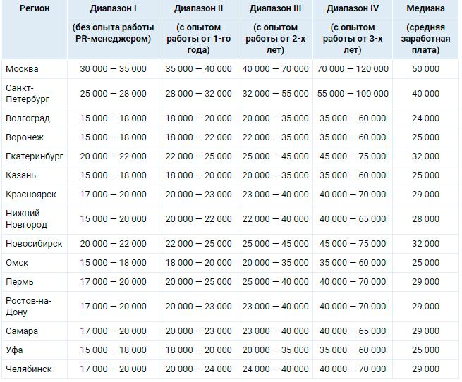 Средняя заработная плата PR-менеджера в Москве составляет 50 000 руб., в Санкт-Петербурге — 40 000 руб., в Волгограде — 24 000 руб., в Воронеже — 25 000 руб., в Екатеринбурге — 32 000 руб., в Казани — 25 000 руб., в Красноярске — 29 000 руб., в Нижнем Новгороде — 28 000 руб., в Новосибирске — 32 000 руб., в Омске — 25 000 руб., в Перми — 29 000 руб., в Ростове-на-Дону — 29 000 руб., в Самаре — 29 000 руб., в Уфе — 25 000 руб., в Челябинске — 29 000 руб.