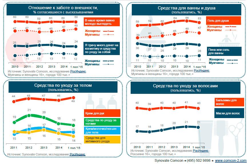 Также выросло и потребление крема для рук. При этом ухаживать за руками больше стали и мужчины (с 11 до 12%), и женщины (с 75 до 79%). Одновременно с этим пользование остальными средствами по уходу за телом осталось на уровне 2014 года.