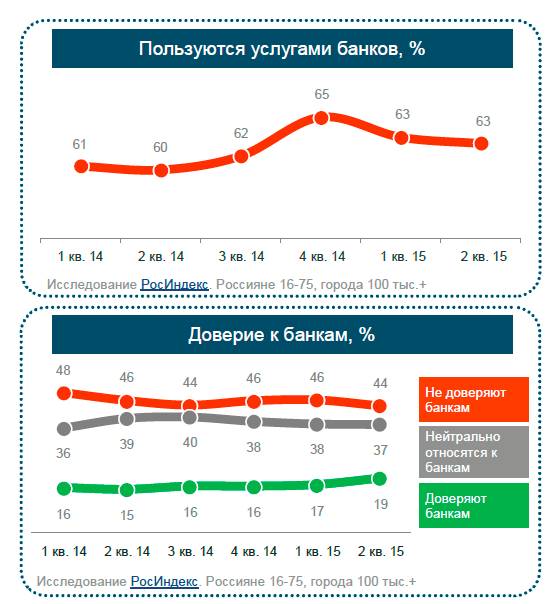 По данным регулярного исследования РосИндекс компании Synovate Comcon во 2 кв. 2015 г. доля пользователей банковскими услугами зафиксировалась на уровне 63%. При этом значимо меньше банками стали пользоваться люди в возрасте от 25 до 34 лет (на 4 п.п. по сравнению с 1 кв. 2015 г.)