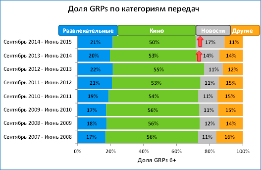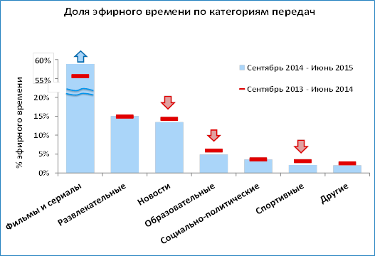 В завершившемся сезоне телеканалы увеличили эфирное время фильмов и сериалов, но при этом снизилась доля образовательных, спортивных и новостных передач. Однако, несмотря на снижение доли эфирного времени новостей, интерес зрителей к ним продолжает расти. Повышение внимания к новостным программам наблюдается с прошлого телесезона. Если с 2007 года от рейтингов всех телевизионных жанров на новостные программы стабильно приходилось 11%-12%, то с прошлого телесезона (2013-2014 годов) ситуация изменилась – доля новостей по рейтингам увеличилась до 14%, а в завершившемся телесезоне – уже до 17%.