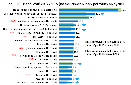 Повышенное внимание к политике отразилось в высоких рейтингах выступлений президента и документальных фильмов на политическую тематику. Самым рейтинговым телевизионным событием остается «Новогоднее обращение президента» (рейтинг 43.6), вторым по популярности стал «Военный парад ко Дню Победы» (рейтинг 26.5), на третьем месте – «Минута молчания 9 мая» (рейтинг 21.9). В ТОП-10 телевизионных событий также вошли: «Прямая линия с В.В.Путиным» (рейтинг 12.4), «Пресс-конференция Президента» (рейтинг 11.8), документальный фильм «Крым. Путь на Родину» (рейтинг 11,7), фильм «Президент» (рейтинг 11.6), чемпионат мира по хоккею (рейтинг 11.2), сериал «Улыбка пересмешника» (рейтинг 13.9) и программа «Время» (рейтинг 10.9) на «Первом канале».