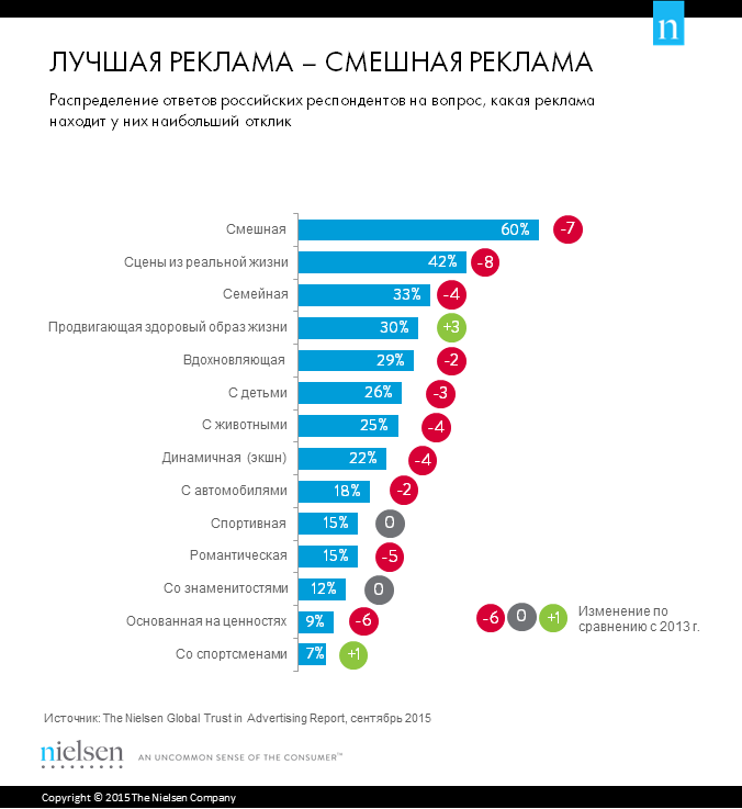 Новое глобальное исследование доверия к рекламе Nielsen показало, что смешные ролики пользуются наибольшей популярностью среди российских потребителей (60%)