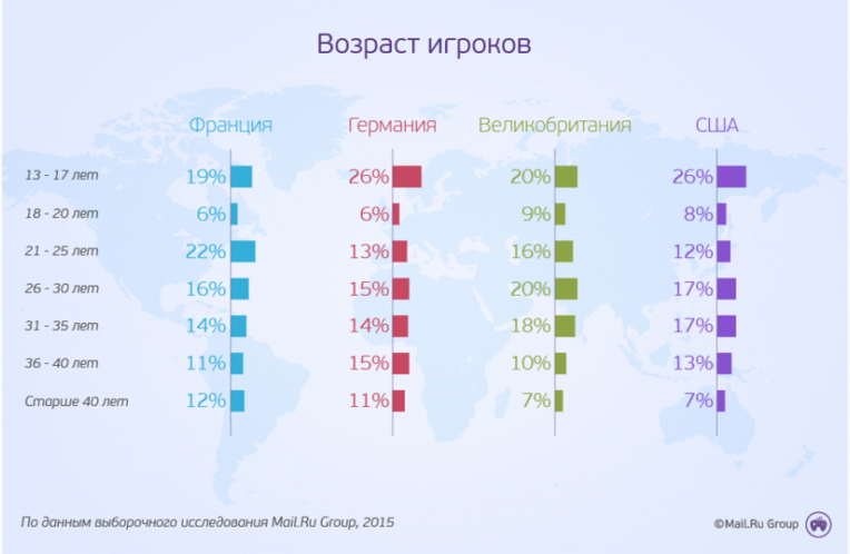 В ходе выборочного исследования зарубежных рынков были выявлены региональные различия между молодыми игроками разных стран. Так, в Германии и США больше играющих оказалось среди подростков (26% от общего числа), а во Франции наибольшая доля игроков – в возрасте 21-25 лет (22%).