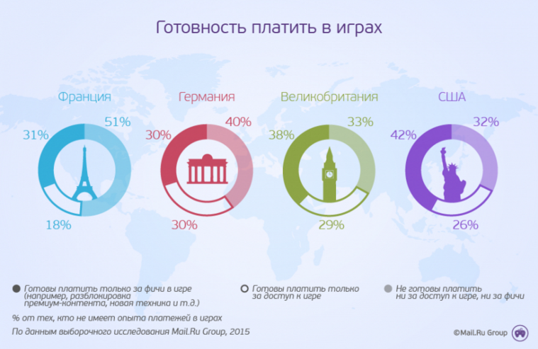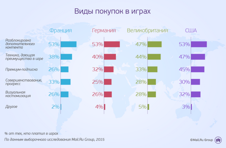 Доля игроков, плативших когда-либо в компьютерных играх, выше всего в США – 53%. В остальных странах это делали меньше половины опрошенных. Наименьшая доля плативших в играх – во Франции и Германии (40% и 38% соответственно). По результатам исследования, большинство платежей осуществлялось за разблокировку дополнительного контента. Меньше всего геймеры платили за визуальную кастомизацию игрового процесса. Стоит отметить, что американцы платят охотнее других за все виды улучшений – в особенности за премиум-подписку.
