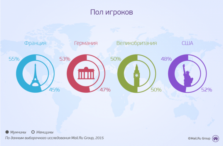 Игры одинаково популярны у представителей обоих полов в Великобритании, а в Германии и Франции женщин-геймеров чуть меньше, чем мужчин (47% и 45% соответственно), а вот в США они, напротив, превзошли в этом сильный пол (52%).
