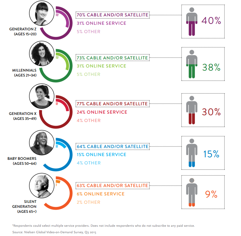 Долгосрочное воздействие растущего рынка онлайн-услуг усилило их популярность среди молодых потребителей. Во всем мире 31% представителей поколения Z (15-20 лет) и столько же среди миллениалов (21-34 года) утверждают, что платят интернет-провайдеру за контент, в то время как то же самое говорят лишь 34% представителей поколения Х (35-49 лет), 15% бэби-бумеров (50-64 года) и 6% старшего поколения (от 65 лет и старше) респондентов.