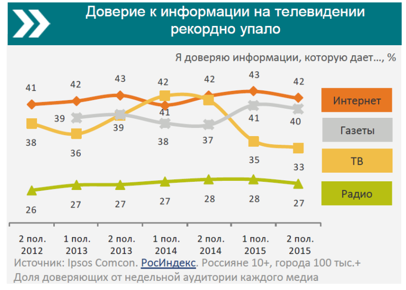 По данным регулярного исследования РосИндекс компании Ipsos Comcon, доверие россиян к телевидению в 2015 году рекордно упало: на 7 п.п. в первом полугодии и на 2 п.п. во втором. Такого низкого уровня доверия к информации на ТВ в России не наблюдалось с 2001 года