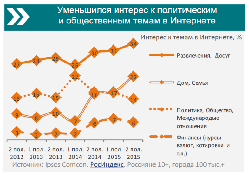 Так, во второй половине 2015 года уменьшился интерес аудитории к политическим и общественным темам в интернете. В 2014-2015 годах россияне стали больше интересоваться финансовыми вопросами. С другой стороны, пользователи интернета гораздо больше внимания уделяют информации, посвященной дому и семье. В 2015 году продолжился долгосрочный тренд роста интереса к развлекательной информации в сети, несмотря на спад в первой половине 2014 года.