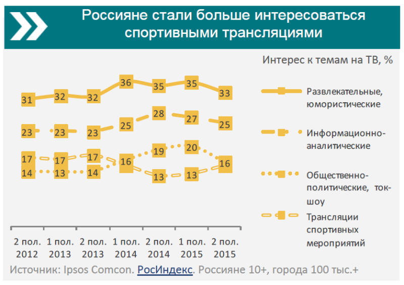 У аудитории телевидения, напротив, наблюдается снижение внимания к развлекательным и юмористическим передачам, за ними теперь отправляются в интернет. Зато происходит увеличение числа россиян, которые отметили, что интересуются трансляциями спортивных мероприятий на ТВ. Одновременно с этим наблюдается падение интереса к общественно-политическим и информационно-аналитическим темам на телевидении.