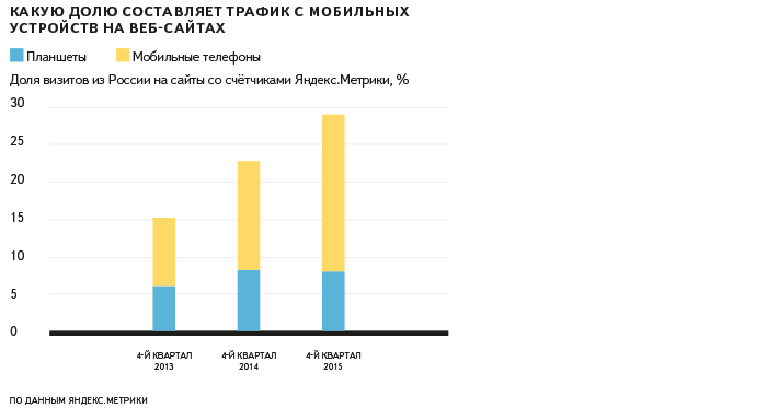 По данным «Яндекс.Метрики», 29% всех визитов на веб-сайты совершается с мобильных устройств. Почти три четверти этих визитов приходится на телефоны, и их доля продолжает расти. Доля планшетов среди визитов со всех типов устройств в этом году даже незначительно снизилась.