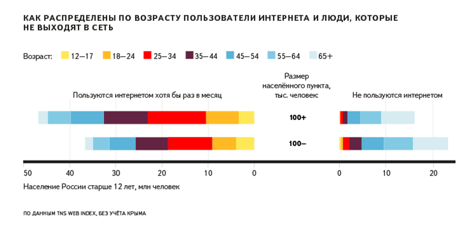 В 2015 году аудитория интернета в городах-миллионниках почти перестала увеличиваться. Резерв для дальнейшего роста в крупных городах — только люди старше 45 лет. В городах с населением меньше 500 тыс. и селах число пользователей продолжает расти, и там еще есть несколько миллионов людей молодого и среднего возраста, которые пока не пользуются интернетом.
