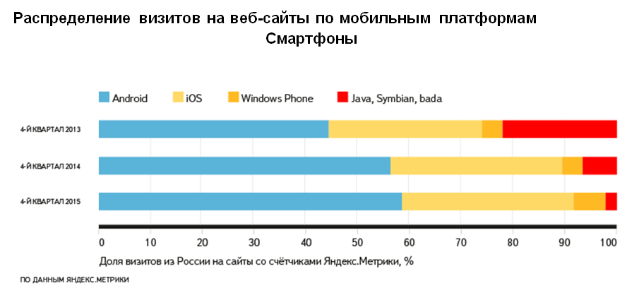 За 2015 год доля Android на смартфонах еще больше увеличилась за счет старых устройств на Java, Symbian и bada. Также за их счет выросли смартфоны Windows Phone. Доля iOS среди мобильных телефонов осталась прежней, а на планшетах iOS в конце 2015 года впервые уступила Android.