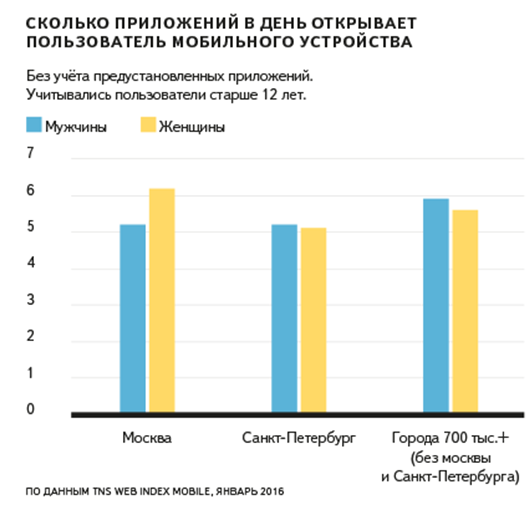 По данным TNS Web Index Mobile за январь 2016 года, каждый день пользователи мобильных устройств запускают в среднем 5-6 мобильных приложений. И это даже без учета приложений, предустановленных на устройстве. Хотя не все приложения используются для выхода в интернет, очевидно, что они в заметной степени заменяют использование веб-сайтов.