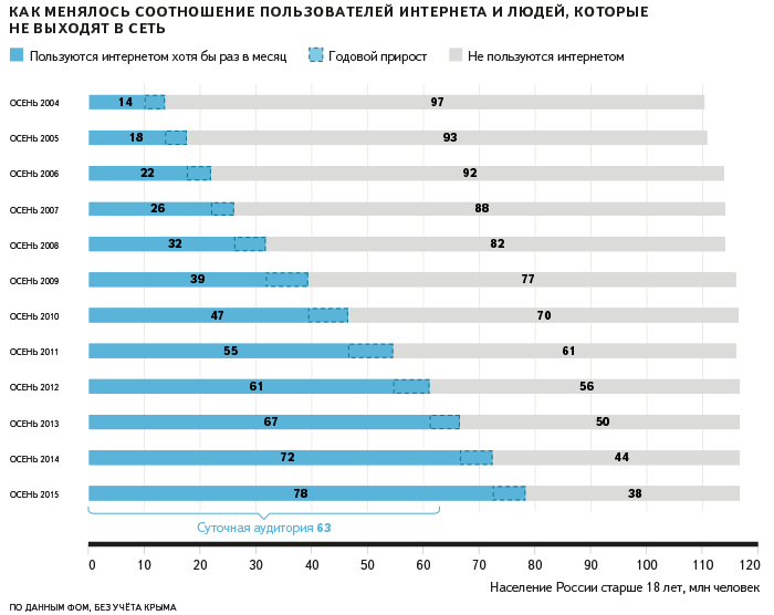 По данным соцопроса Фонда «Общественное мнение» (ФОМ), осенью 2015 года интернетом в России хотя бы раз в месяц пользовались 78 млн человек старше 18 лет. Проникновение, то есть доля пользователей интернета среди населения этого возраста, — 67%. Почти такое же проникновение — 69% — показано в исследовании Web Index группы TNS, в котором учтены пользователи старше 12 лет. Оба этих источника не учитывают жителей Крыма.