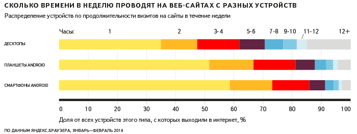 Смартфонов у пользователей в несколько раз больше, чем планшетов, поэтому суммарный трафик с мобильных телефонов больше, чем с планшетов. В то же время активность пользования интернетом через браузер на планшетах выше, чем на смартфонах, а на десктопах и ноутбуках — выше, чем на любых мобильных устройствах.