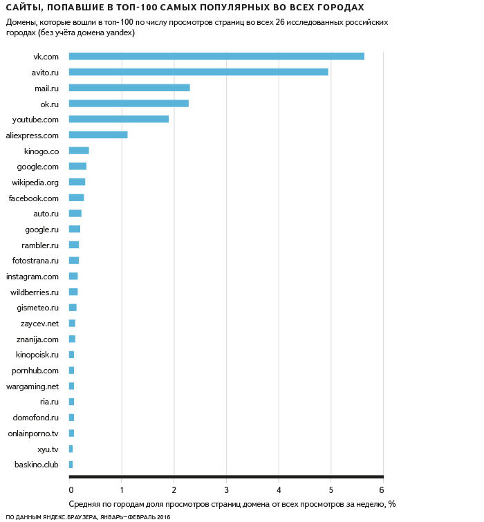 В среднем на такие локальные сайты приходится лишь около 2,5% всех просмотров, однако в трех городах трафик на уникальные для города сайты превышает 7% — в Красноярске, Казани и Севастополе. В Красноярске большой популярностью пользуются местные сайты совместных закупок, аукционов и автомобильных объявлений. В Севастополе активно читают не только российские, но и украинские сайты. Выше среднего интерес к местным сайтам в Хабаровске, Челябинске и Калининграде — там они получают по 3-4% трафика.