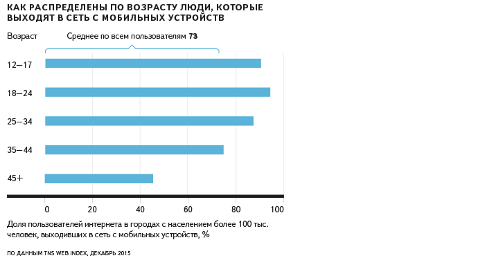 Выше всего проникновение мобильного интернета среди молодых людей — около 90% пользователей младше 35 лет выходят в интернет с мобильных устройств (только с них или наряду с десктопами).