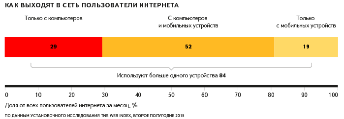84% пользователей интернета в течение месяца используют для выхода в сеть больше одного устройства — например, рабочий и домашний компьютеры или компьютер и мобильное устройство. Больше половины аудитории использует мобильные устройства наряду с компьютерами, а пятая часть и вовсе выходит в интернет только с них.