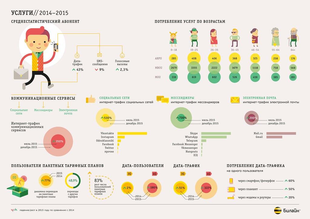 Все чаще абоненты используют мессенджеры, социальные сети и электронную почту, которые становятся заменой традиционным смс-сообщениям. В декабре 2015 года трафик, сгенерированный при использовании этих сервисов, вырос в 4,5 раза по сравнению с июлем того же года