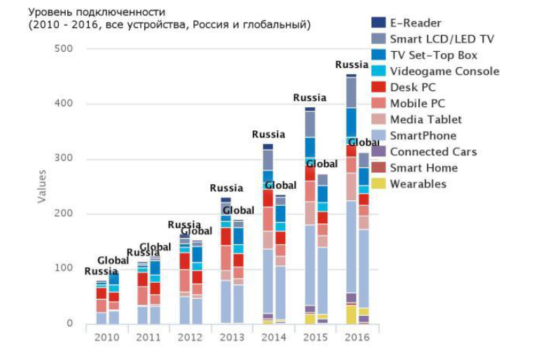 По мнению Кевина Уолша, директора подразделения исследования трендов и прогнозирования компании GfK, рост подключенности – это макро-тренд, который наблюдается сейчас во всех странах мира. На быстрорастущих рынках, особенно на Среднем Востоке, в Африке, в развивающихся странах Азиатско-Тихоокеанского региона, главным драйвером остается проникновение смартфонов. Это главный (а часто и первый) гаджет, который потребители используют для доступа к сервисам обмена данными. Этот тренд, вероятно, останется доминирующим в ближайшие два-три года, чему способствует и снижение цен на эти устройства, благодаря которому свой первый смартфон в этом году смогут приобрести более одного миллиарда потребителей.