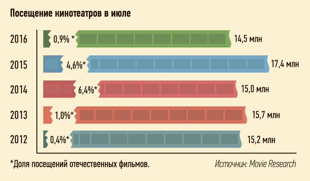 Результат посещаемости российских кинотеатров в июле 2016 года стал худшим за последние пять лет (с 2012 по 2016 год). Посещаемость на пике лета составила всего лишь 14,5 млн зрителей — на 16,4% меньше, чем в июле 2015-го. Таковы результаты исследования независимой компании Movie Research, предоставленные «Известиям».