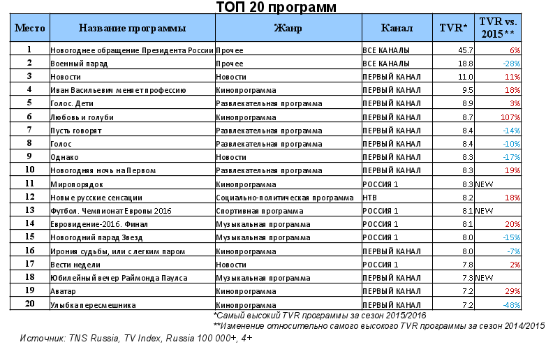 Большинство топовых программ последнего ТВ-сезона присутствовали в эфире и в предыдущем сезоне. Однако популярность трети этих программ снизилась. Например, рейтинг новогоднего парада звезд упал на 15%, развлекательной программы «Пусть говорят» — на 14%, «Голос» — на 10%. Что касается новых развлекательных программ телесезона, то большинство из них были не очень успешны. Хороших рейтингов удалось достичь шоу «Вместе с дельфинами» на Первом канале и «Где логика?» на ТНТ.