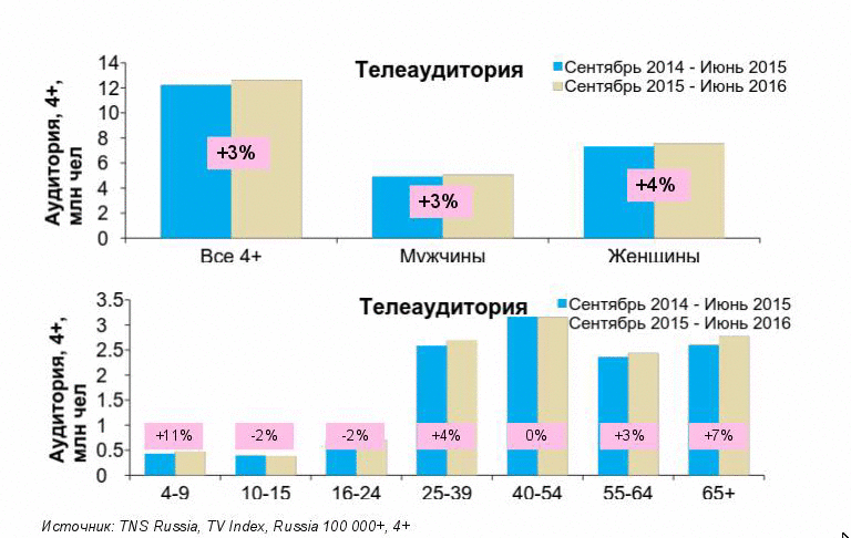 Телесезон 2015-2016 гг. показал рост аудитории на 3%, в основном, за счет детской аудитории в возрасте 4-9 лет (+11%) и зрителей старше 65 лет (+7%).