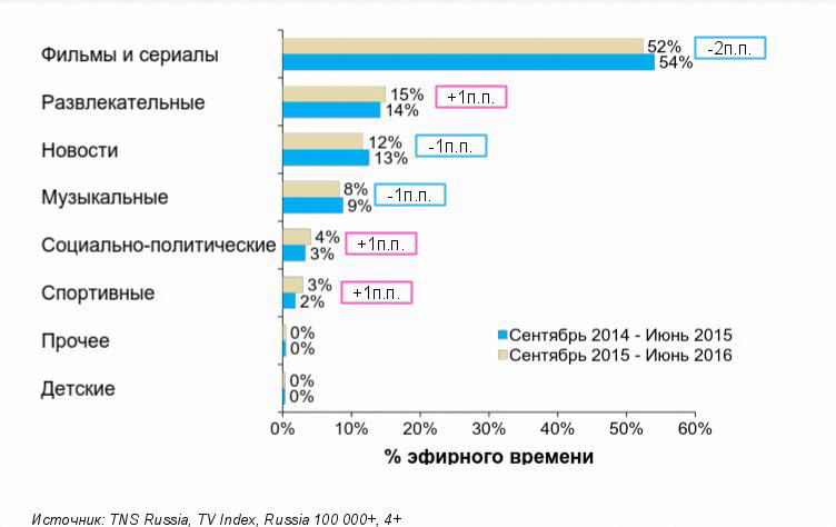Агентство подвело итоги телесезона 2015-2016 гг. Телеканалы увеличили долю развлекательных, социально-политических и спортивных программ, но при этом сократили эфирное время фильмов, новостей и музыкальных программ