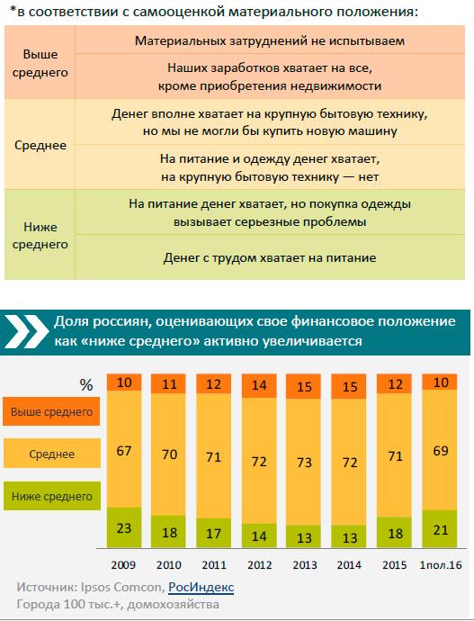 21% домохозяйств в первой половине 2016 года оценили свое материально положение как «ниже среднего», при этом в 2013 году так свое положение оценивали лишь 13% семей.