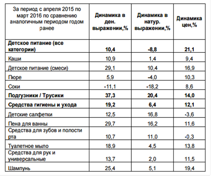 В денежном выражении рост продаж детской одежды составил 4,8%. Главное препятствие для роста потребления – рост цен: более чем на 22% на одежду и 28% на обувь в сегменте специалистов. Скорее всего такая динамика цен связана с высокой долей импорта как в готовой продукции, так и в материалах. Товары для новорожденных – единственный сегмент, который прошел «дно»: по данным аудита розничных продаж GfK, уже в первом квартале 2016 года он демонстрировал стабильные приросты в натуральном выражении по большинству товарных категорий.