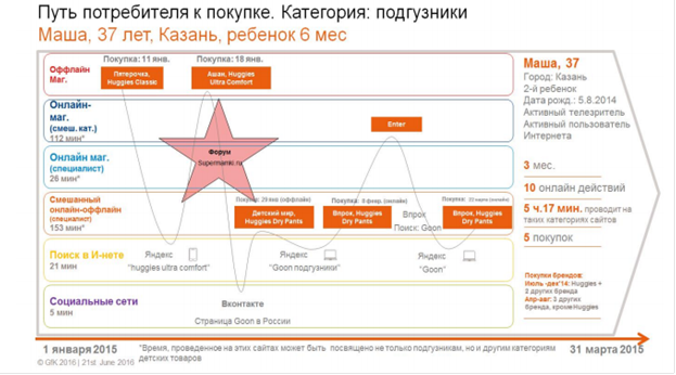 Пример пути потребителя к покупке в категории подгузники, 2015 год. Данные кросс-медийной панели GfK
