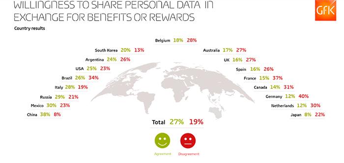Более четверти (27%) интернет-пользователей в 17 странах мира согласны поделиться своими персональными данными в обмен на скидки или персонализированный сервис, говорится в исследовании GfK. Категорически не желают делиться своими данными лишь 19 процентов потребителей. В опросе приняли участие 22 тыс. человек старше 15 лет (в России – от 16 лет). Абсолютное согласие с предложенным утверждением выразили равное количество мужчин и женщин – по 27% процентов. При этом несогласных с утверждением оказалось больше среди женщин – 21%, тогда как мужчин – 18%.