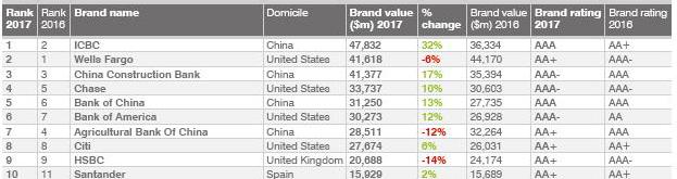 Brand Finance представил рейтинг самых дорогих мировых брендов банков, сообщает пресс-служба компании. Первую строчку занял промышленный и коммерческий банк Китая ICBC. Рост стоимости его бренда по сравнению с 2015 годом составил 32% и теперь равняется $47,8 млрд. На втором месте американский Wells Fargo, стоимость его бренда оценивается в $41,6 млрд (-6% в сравнении с 2015-м). На третьем месте China Construction Bank ($41,3 млн). По сравнению с 2015 годом он прибавил 17%.