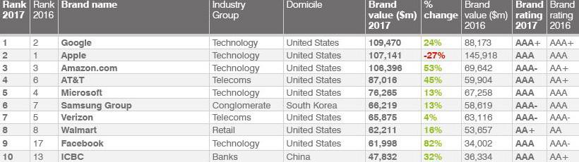 Третье место в рейтинге за Amazon.com. Стоимость бренда оценивается в $106,3 млрд, рост по сравнению с 2015 годом составил 53%. В десятке также оказались телекоммуникационная компания AT&T, Microsoft, Samsung Group, Verizon, Wallmart, Facebook, а также промышленный и коммерческий банк Китая ICBC.
