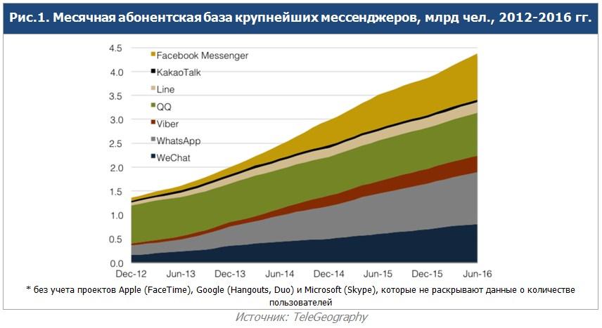 В число крупнейших мессенджеров в мире входят WhatsApp (1,2 млрд пользователей в конце 2016 г.), Facebook Messenger (1 млрд в середине 2016 г.), QQ (900 млн на 3 кв. 2016 г.), WeChat (846 млн на 3 кв. 2016 г.), Skype (более 300 млн на конец 1 кв. 2016 г.), Viber (260 млн на конец 2016 г.) и Line (217 млн в конце 2016 г.).